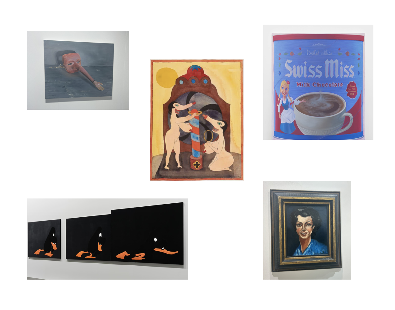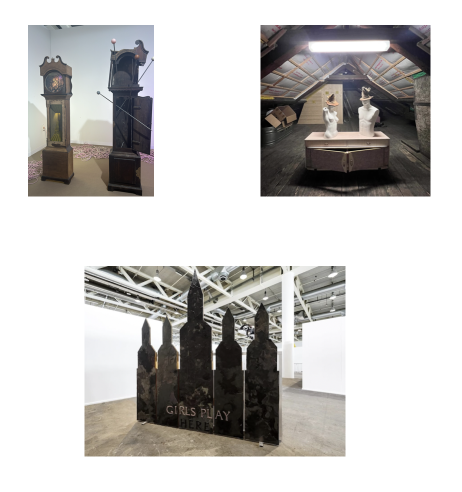 The next day I met K.O. Nnamdie, owner and curator of Eidmann Gallery, at Frieze. I didn't tell them about Zechariah—not yet. Instead, we chatted about the allure of Los Angeles, a failed bookstore, laughable presentations. I leave K.O. to explore on my own. I circle the booths, projecting Zechariah's unknown expression on middle-aged men wearing designer or boys with funny faces and receding hairlines. Zechariah still hasn't replied. Editors from a magazine told me frieze was a boring, bloated event for wealthy cretins. Another impressive iteration of "luxury items" for Bezos types. Regardless, I stopped at Lomex's booth with a male nude sculpture twisted with missing limbs by Kye Christensen-Knowles, along with several portraits of Hiji Nam, Diane Severin Nguyen, Olivia Kan-Sperling, and Liv Cuniberti in his typical dystopian coldness. Each subject is wearing black, seated in a folding chair against a rough backdrop.