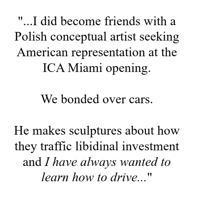 Every night after leaving the convention center, I felt restless, easily tired, and terribly hungry. I couldn’t stay long at any of the museum openings. The shows all looked refined and expensive, but I felt disturbed by the number of women attending these openings hoping to find a high-earning man. I wanted to be honest with them and tell them the tragic truth about life. Still, I decided against it. It would be good karma for me to let them live with their illusion of what Art Basel is for a week. I did become friends with a Polish conceptual artist seeking American representation at the ICA Miami opening. We bonded over cars. He makes sculptures about how they traffic libidinal investment and I have always wanted to learn how to drive. Every night, we skipped parties in membership clubs and island houses and enjoyed big meals at gentrified ethnic restaurants in Little Haiti. He was attracted to me, I could tell. Alas there was nothing I could do about his useless attraction.