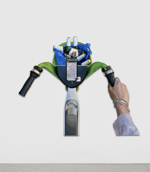 But Eaton’s latest show at Carl Kostyál trades in the cleverness of his previous work for banality. He’s still making photorealistic paintings, except now he has ditched openings in public space as his primary subject – seemingly in favour of relatable moments (a lime bike?) and things that lend themselves to being painted photorealistically (a crashed car, a fire extinguisher, a parking ticket). There is no denying that the paintings look good, Eaton does photorealism well, but instead of the angular constraints and clean lines of his previous work we now get a series of paintings depicting a benign jumble of crumpled and shiny objects that do little more than showcase his technical ability.