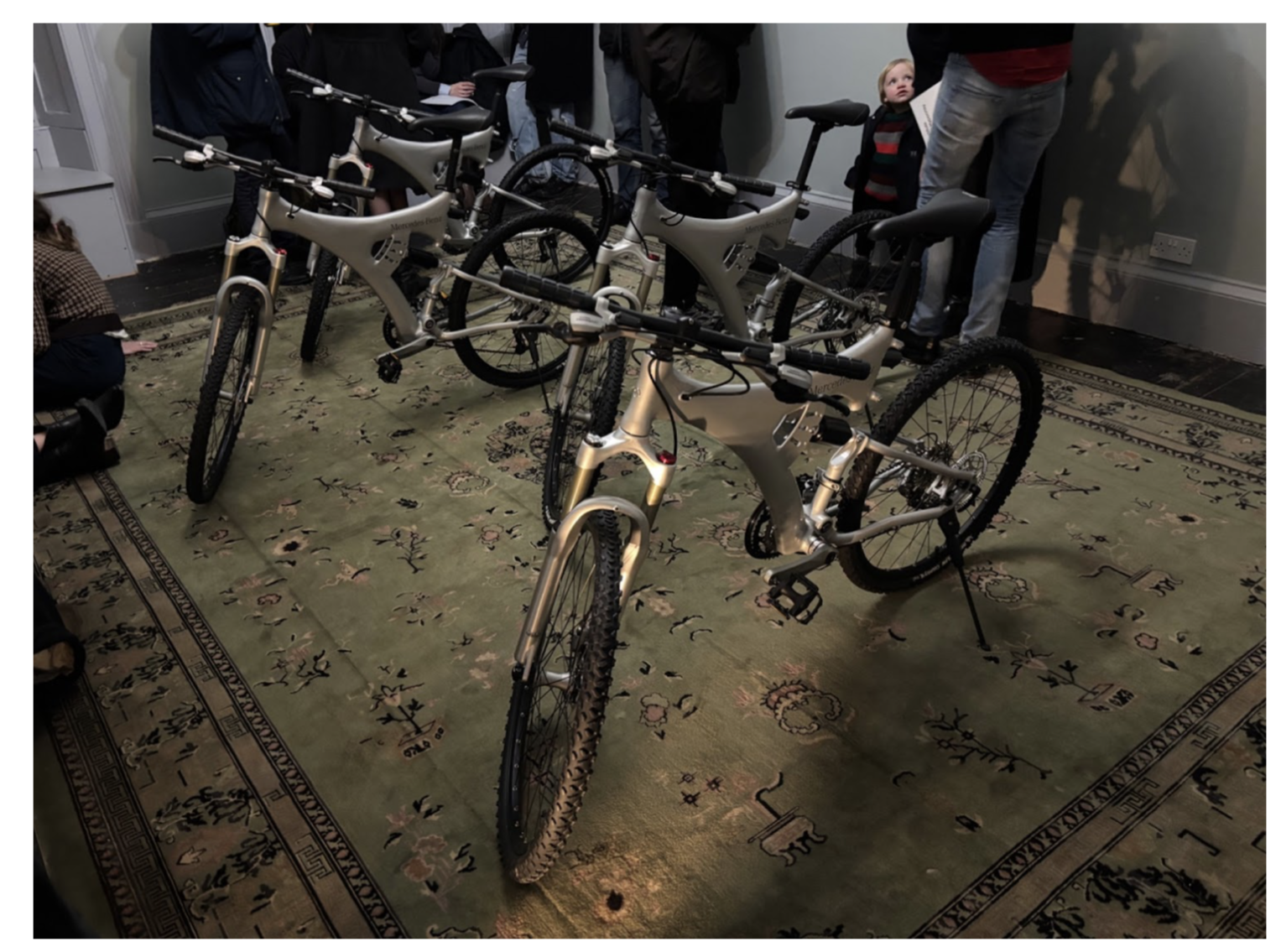 I overhear an American voice confirming that I was probably in the right place. Heading up to the top floor of the tenement flat we are greeted with a dram of whiskey in true Glasgow fashion. We enter the living room of gallery owner Richard Parry’s family home where four Mercedes-Benz dual suspension patronise the carpet. I'm quickly airdropped to 1990s Cologne with Kippenberger et al. Present. The steeds are lined up in the centre of the room, taking the form of either trophy horses or the swaggering cool kids in the school playground. I sat down against the wall and began to read the fifteen-page press release. Around halfway through, I look up and see musician and artist Joanne Robertson get told off for grabbing the handlebars, which made me giggle. I too was wondering how well these bikes could do a wheelie. The press release serves as some form of ancient manuscript regarding the mystifying history of the bikes, their conception, storage and eventual delivery to the living room of Richard Parry. To quote from the singing voice of a mouse who had eaten its way through the bike's brake cables in the barn where the work was stored: