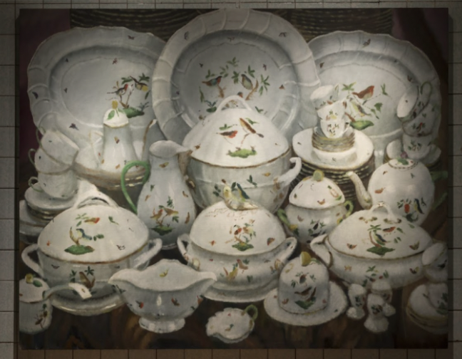 But back to the point: rooms upon rooms of unquestioning ugliness. D1NNER (2025) stages a kind of post-Carrollian tea party (‘Have always been fond of him’, noted Vladimir Nabokov in Strong Opinions. ‘One would like to have filmed his picnics’; if only Wood were so risky as to engage two of history’s great quasi-nonces) but for whom? Floral teapots, cups and dishes line up across an unattended, almost depthless frame – neither synecdochic nor particularly expressive, they evoke little that’s felt and reveal nothing. Crisis Is (2020) – continuing Wood’s distinctly Y2Kish fixation on twentieth-century cars – is part car-dealership-website-ad as AI-interpreted in the style of Philip Guston, part Lana Del Rey music video mood board. Paintings that just hope you’re thinking what they’re thinking. Wood’s recent portrait of Charli xcx for Vanity Fair postdates the exhibition, but in its ability to capture nothing that we don’t already know about the pop idol from pre-existing footage, it would have done well here.