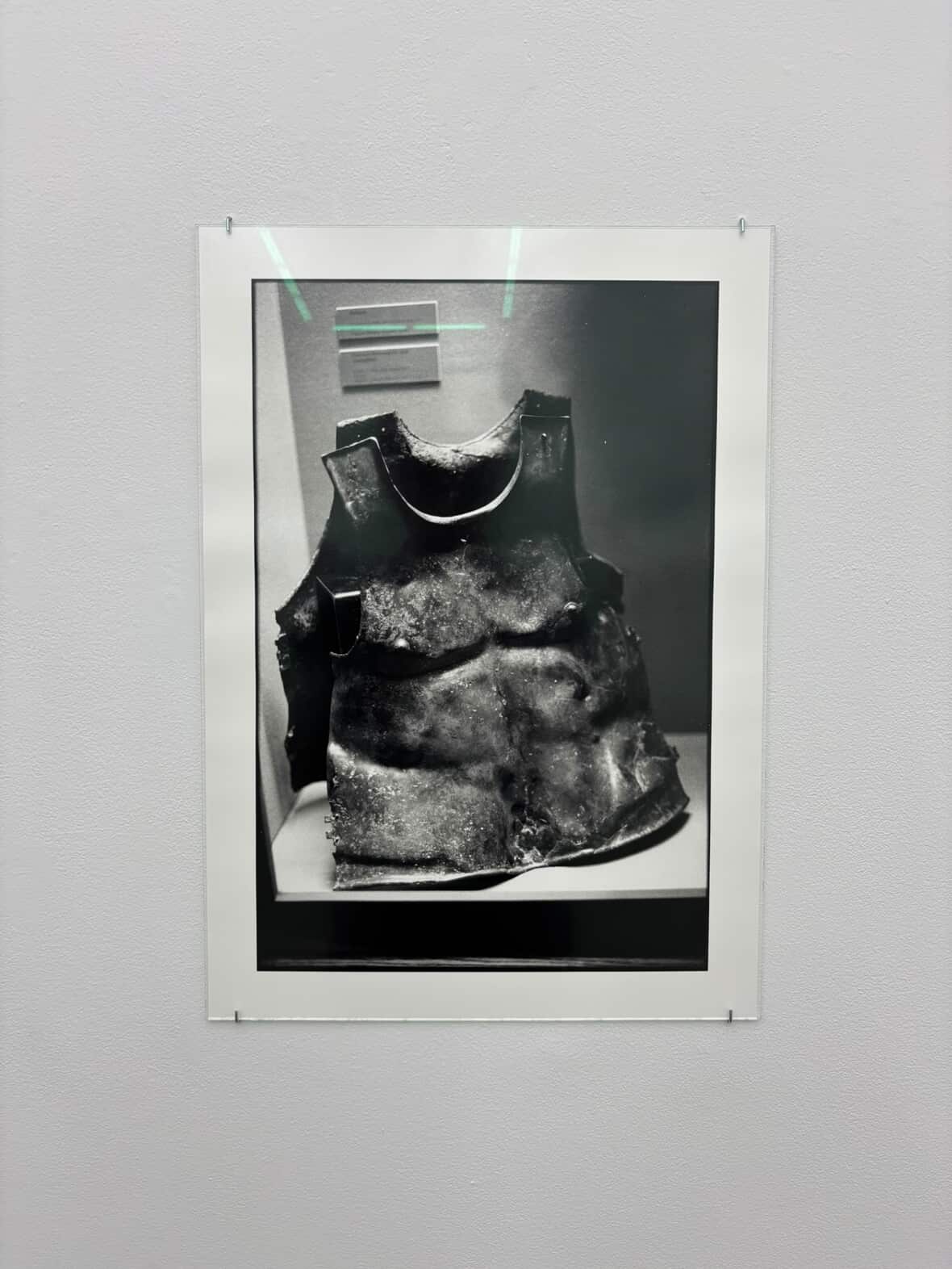This rupture is concentrated in one photograph, Display IX (1994/2025), displayed on the wall directly behind the viewer as they descend the stairs to the main gallery dedicated entirely to photographs of garments used in war and feudal contexts. Having been initially confronted with images of statesque armour, frozen in mechanical movement, repeated, doubled, and pictured ever so slightly differently to the point that their historical idiosyncrasies are rendered moot, the act of turning around and seeing the broken ab-laden torso of a broken muscle cuirass depicted in Display IX (1994/2025) wrests the most powerful element from repetition’s grasp—difference. And with it, desire floods the scene, too.