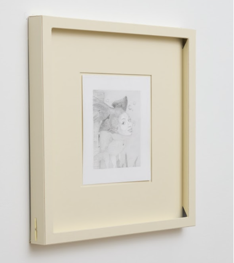 The curious part of Kronz's works is the presence of the figurative. For Independent Artist (2025) Kronz cuts out the internal corners of the frame, forming pockets of shadow that can’t be seen from a frontal view. Frame and drawing become subsumed into a singular artwork, contrasting the separation of the two in McKenzie’s pieces. Kronz’s soft, graphite lines depict, unnervingly, a cartoon fish with a woman's face. Faintly nïave, slightly perverse, resembling a pre-millennium illustrated children’s character or a Henry Darger prepubescent girl.