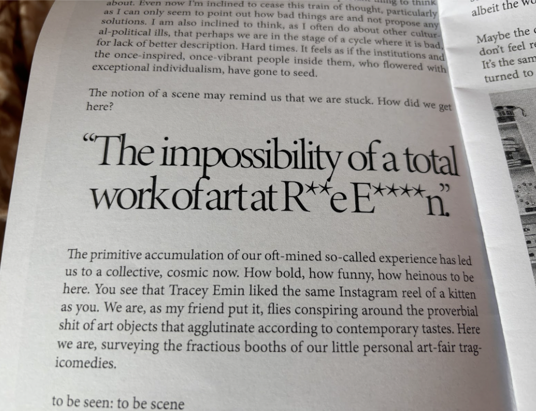 At about seven thirty, we hear from the editors in a letter that seeks to position themselves in relation to institutions, literary readings, commercial art, and the nebulous ‘scene’ that orbits them. “It's not just the woke art that is bad”, Alex reads , "although that's most of it.” Artists, like teenagers, have always forged identities in relation to what they are not.