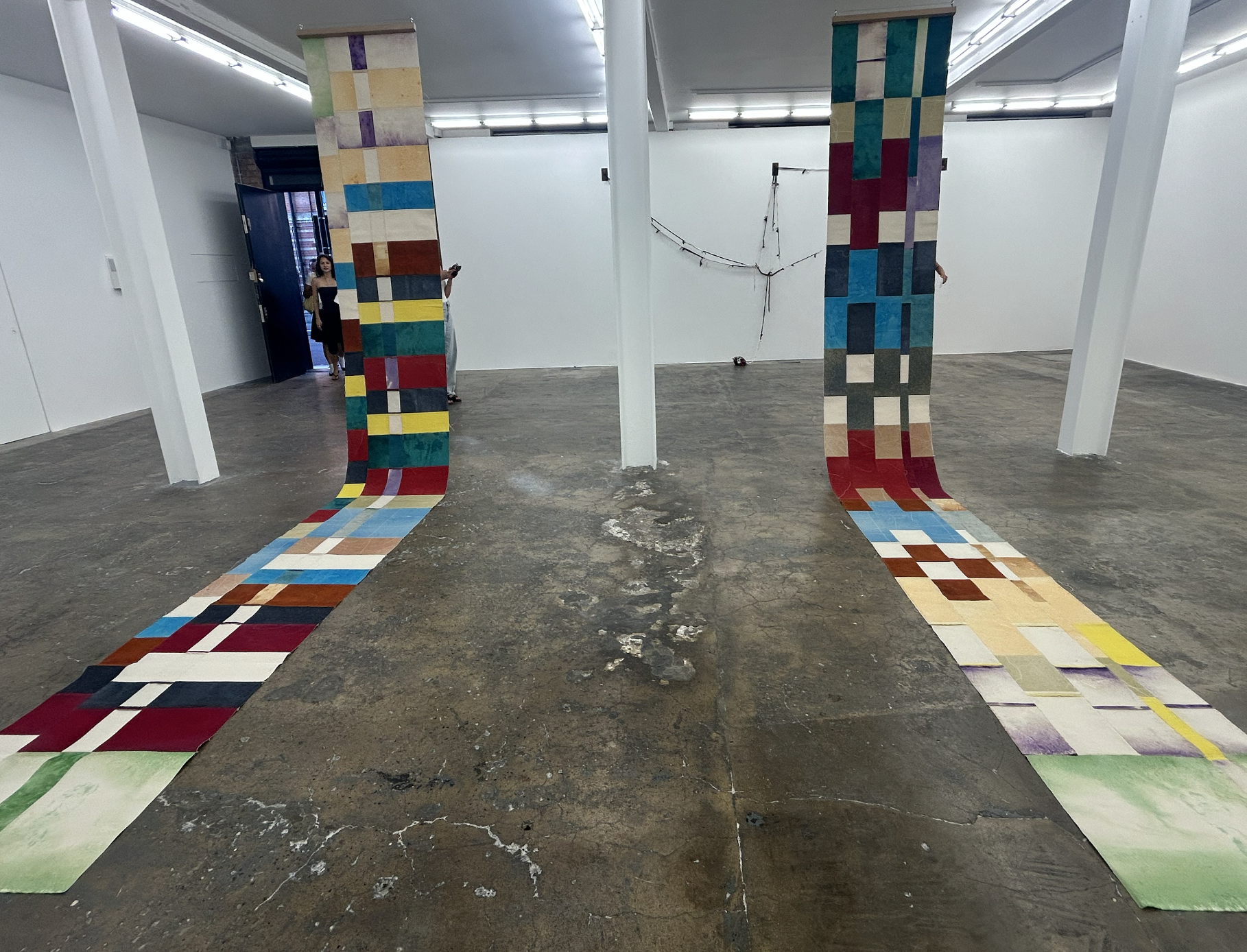 In Rough Draft two stretches of stitched canvas hang in the centre of the gallery. Bars and Blocks (Janky Hankies) (L) and ® droops onto the floor three-quarters down, the underside of their stitched panelling clearly on display. You can examine up close Samuel’s building of patchy coloured canvas, sometimes bleached, sometimes block colour. One half of the title, “Janky Hankies” refers to the colour-coded signalling system popular in West Village gay communities of the 70s and 80s. It could mean “top” or “bottom” or - according to Bob Damron’s Address Book (1980) key sexual information: